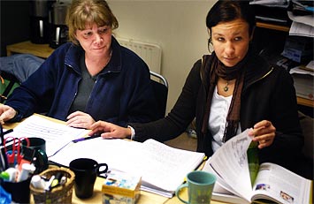 JOBBSKOLA. Alexandra Göransson, till höger, utbildar sig till undersköterska på sin egen arbetplats, vid hemtjänsten, i Malmö. Hennes handledare Carina Gustafsson övervakar skolarbetet.