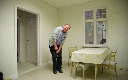 ”Möte med döden 1” heter scenen som kommer att bli lite drygt tre minuter. I veckor har scenarbetarna arbetat med köket och utsikten mot bakgården. Nu återstår ytterligare en veckas hårt arbete, tror Roy Andersson.