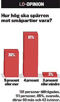 Bara tre procent i LO-opinion vill sänka spärren för småpartier. 61 procent vill behålla den nuvarande spärren på fyra procent.