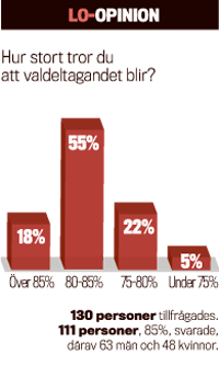 Majoriteten i LO-opinion tror att valdeltagandet blir ungefär lika stort i år som 2006 – men 27 procent tror att valdeltagandet kommer att minska. 18 procent tror att valdeltagandet ökar.