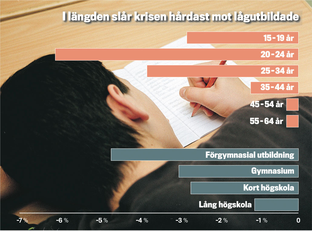 Diagrammet visar minskningen av andelen sysselsatta inom olika grupper i år jämfört med för två år sedan. Även om unga mellan 20 och 24 år ser ut att vara hårdast drabbade får de lättare jobb så fort konjunkturen vänder. Allra svårast har människor som inte ens gått gymnasiet. I den gruppen har sysselsättningen minskat med 4,5 procent under de här åren, samtidigt som de till antalet har blivit 50 000 personer färre.