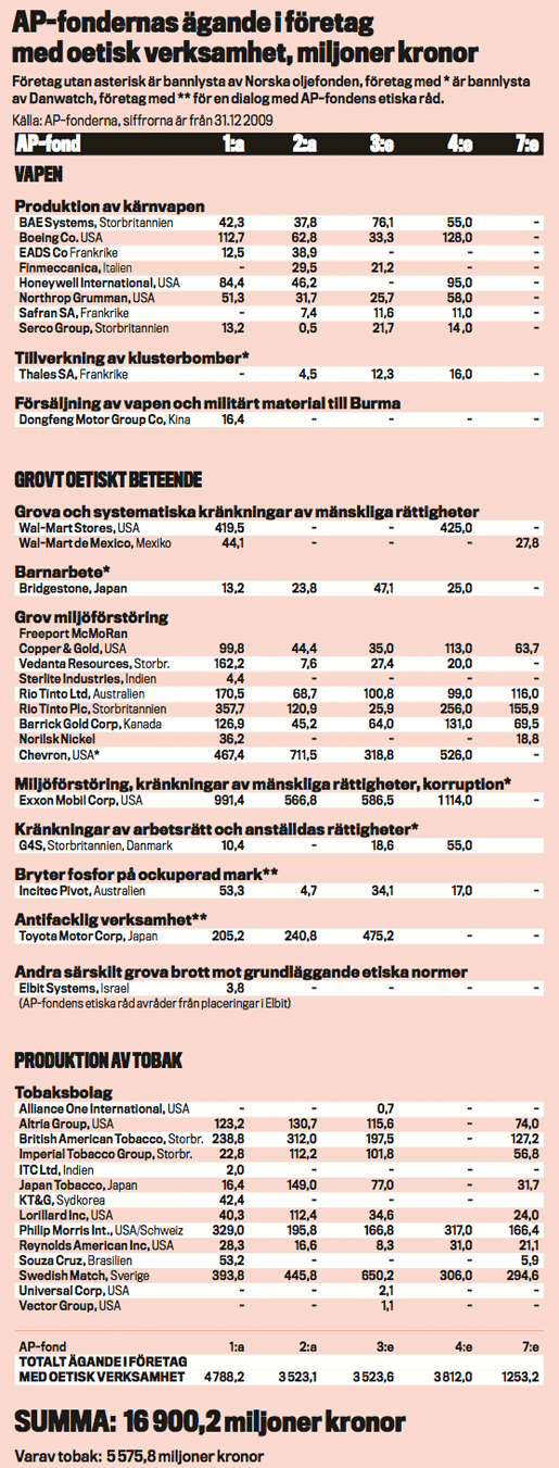 Lägger man till investeringar i tobaksbolag, som norska pensionsfonden svartlistade under hösten 2009, tillkommer 14 bolag till ett värde av 5,5 miljarder kronor i AP-fondernas investeringar.