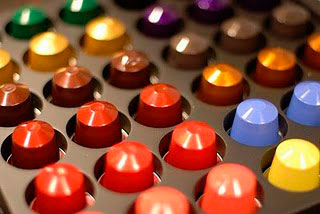 Espressomaskinen ett tiotal meter från Sahlins kontor laddas med dovt skimrande patroner.