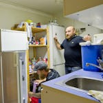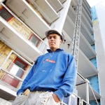 Tomas går förbi nedanför. Han har inget emot att både bo och jobba ihop med sina arbetskompisar.
