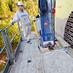 Tomas och Pelle går ut för att blanda till bruk. De fyller några skottkärror och ställer i bygghissen.
