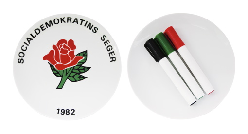Forsgren utgick från en existerande samlartallrik som fanns till salu i samband med valet 1982, beställde kopior av den och kompletterade med en tom, likadan tallrik, som levereras med pennor i rött, grönt och svart, vilket gör det möjligt att designa sin egen tallrik, och även sudda ut och ändra om. Även instruktioner och äkthetsbevis medföljer.