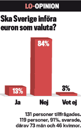 Motståndet mot euron förblir kompakt. 84 procent i LO-opinion vill inte införa euron i Sverige.