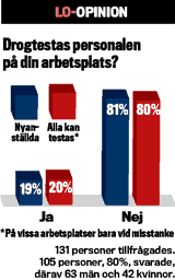 En av fem i LO-opinon jobbar på en arbetsplats där de som söker jobb blir drogtestade innan de anställs. På var femte arbetsplats drogtestas personalen, ibland genom slumpmässiga stickprov och ibland enbart vid misstanke.