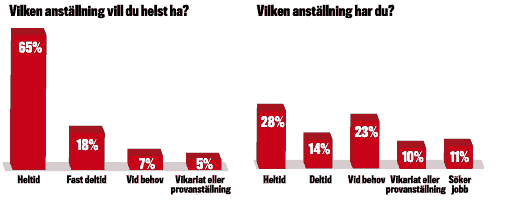 Sex av tio ungdomar mellan 18 och 26 år vill ha ett fast jobb på heltid – men färre än tre av tio är fast anställda på heltid. Nästan hälften har deltid och/eller tillfälliga jobb. 23 procent blir inringda vid behov jämfört med 28 procent som är fast anställda på heltid.