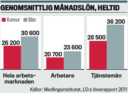 Medan män i snitt fick 26 700 kronor i utbetald arbetsinkomst varje månad 2009 fick kvinnorna nöja sig med 19 100 kronor, enligt regeringens beräkningar i jämställdhetsbilagan till statsbudgeten.