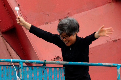 Mat och dryck under den 309 dagar långa protesten fick Kim Jin-suk genom att fira ned en hink till sina fackliga kamrater på marken.