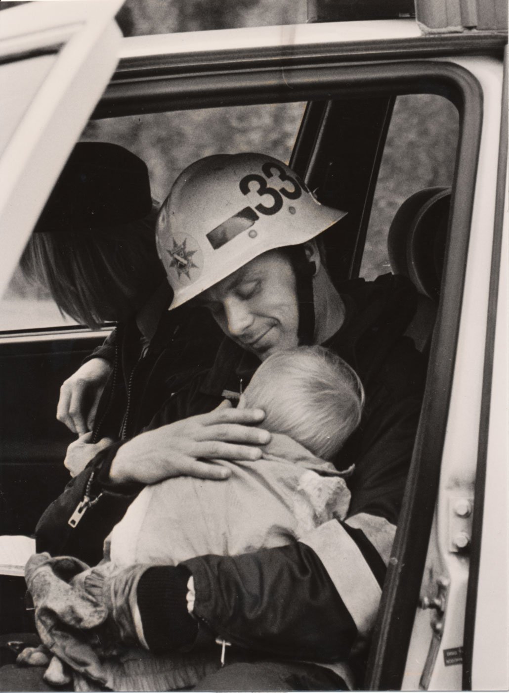 På andra plats i Arbetets fototävling kom den numera pensionerade brandmannen Tommy Lindblom med en bild på kollegan Mats Tollsten som tröstar en liten pojke efter en trafikolycka utanför Borlänge.