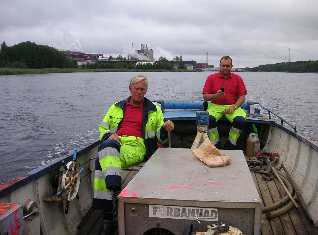 Tävlingens tredjepris går till Hans Hägglöv på Hallsta pappersbruk. Han har fotot sina arbetskompisar Jan Carlberg och Björn Fredriksson som är på väg ut för att röja sly utanför fyrarna i Edeboviken, Norrtälje skärgård.