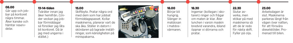 Han är skogsarbetare och kör skördare, vilket innebär att han fäller träd och lägger stammarna i prydliga högar, som sedan kollegan i skotaren plockar upp och fraktar till vägkanten. I hans företag är de fyra som jobbar i tvåskift, från sex på morgonen till elva på kvällen. Förutom på fredagarna då schemat är kortare.