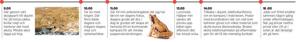Det blir mycket sådant arbete i skjulet – skriva i bloggen, mejla och sammanställa dokument. Ibland reser hon till konferenser för att möta dem hon annars bara kommunicerar med digitalt, men det sker mer sällan nu än förr. Under arbetet med sin bok Paper trails följde hon pappersanvändningen över hela världen, från träd till pappersmassa till papper, för att visa alternativen – men också beskriva hur viktigt papper är för vår kultur.