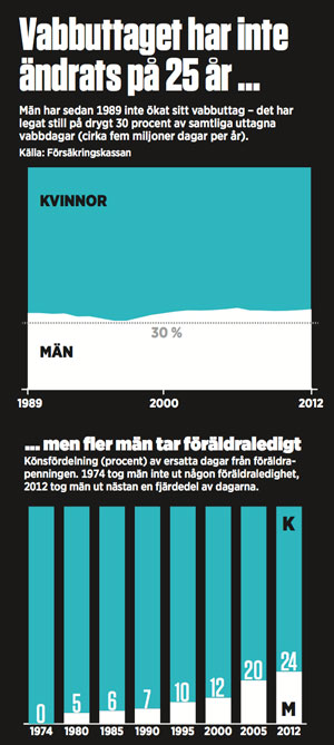 Från 1989 kan Försäkringskassan räkna vabbdagarna för sig, och enligt den statistiken har papporna ökat sitt vabbande med 1,7 procentenheter på nästan ett kvartssekel. Ökningstakten i pappornas föräldraledighet har däremot varit tio gånger större under samma period.