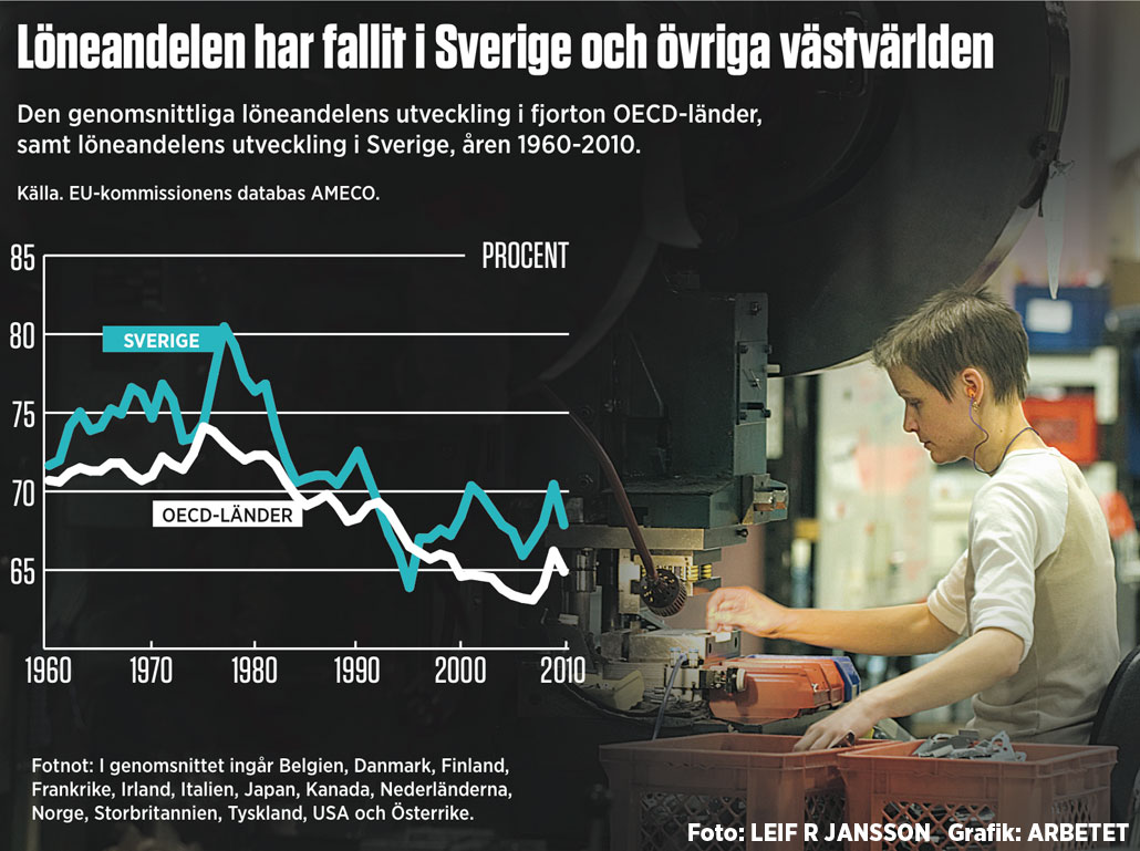 Löntagarna får allt mindre. Deras del av de samlade inkomsterna har över en längre period fallit i Sverige och övriga västvärlden.