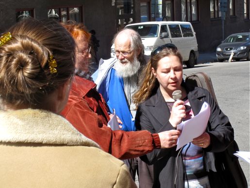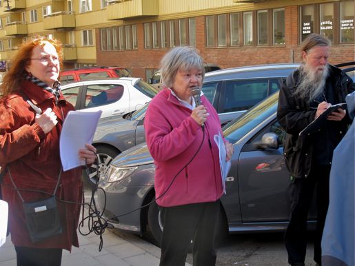 Maria Nyman Stjärnskog, LO Skåne, läser upp en text av Maria Sandel på Kronobergsgatan.