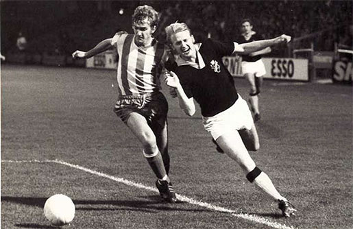 Åren mellan 1965 och 1970 var Reines allra bästa fotbollsår, krönta med mästerskapet 1969, Tio säsonger i Blåvitt blev det för Reine Feldt, här i närkamp med en motspelare från AIK.