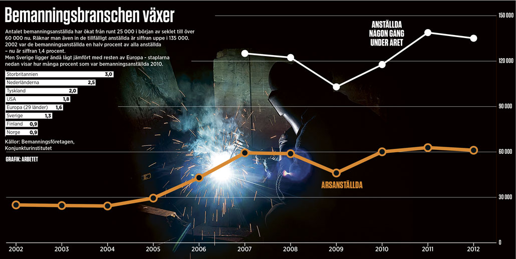 Och så bemanningsföretag. De blev tillåtna 1993. Det första bemanningsavtalet skrevs 2000.