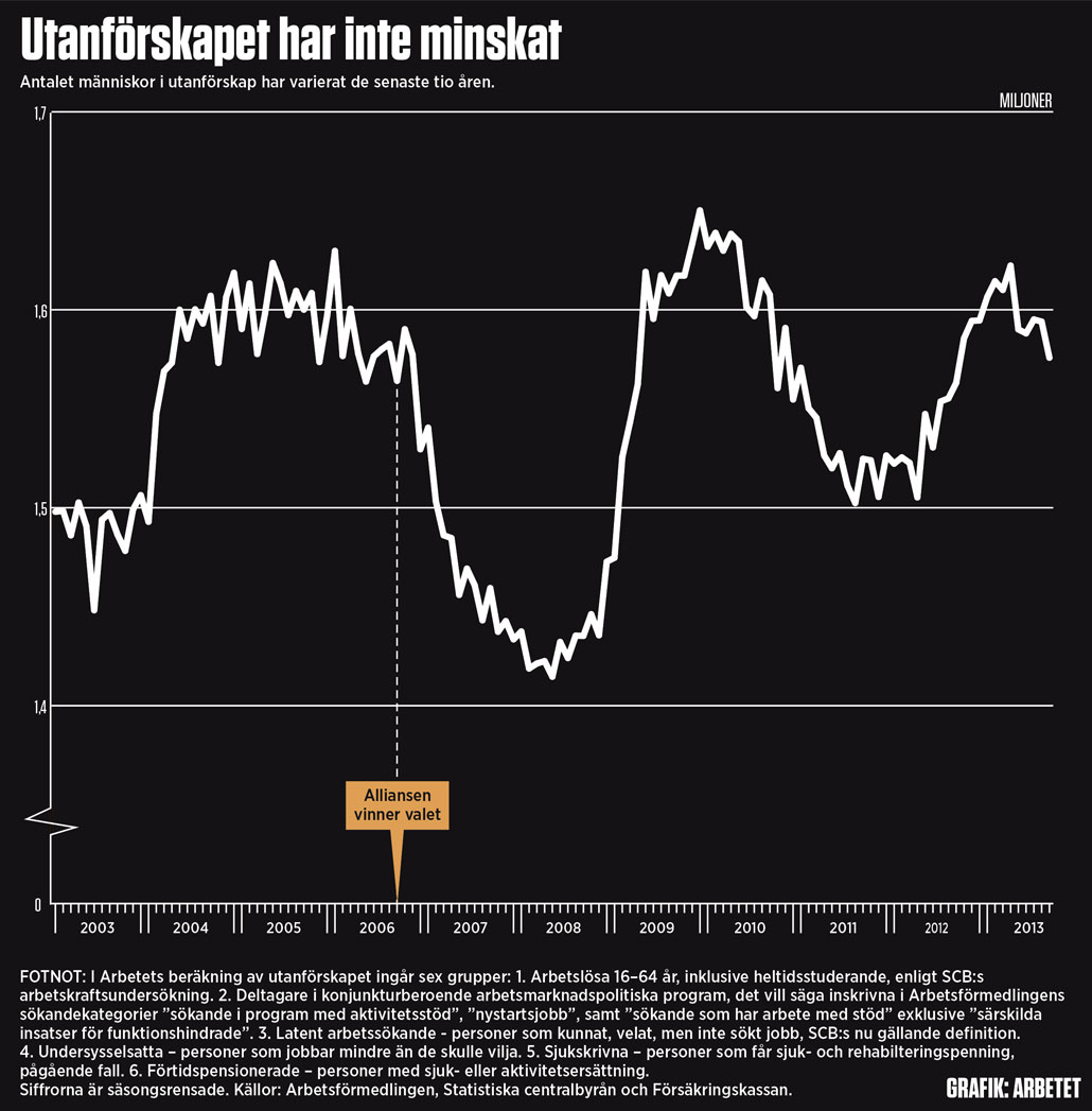 I augusti 2006, före valet, räknades 1 582 760 personer till utanförskapet. Sju år senare var motsvarande siffra 1 601 627. Således nästan 19 000 fler.