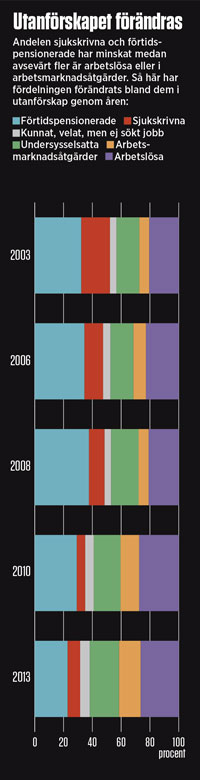 Däremot har sammansättningen av utanförskapet förändrats (se diagrammet härintill). De sjukskrivnas och förtidspensionerades andel har minskat – från att utgöra knappt hälften av utanförskapet till drygt 30 procent. I stället är det fler som nu är arbetslösa eller i arbetsmarknadsåtgärder.