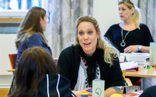 Diskussioner, grupparbeten, kanske lite korvstoppning … Therese Johansson lär sig arbetsrätt på Runö folkhögskola. Foto: Claudio Bresciani