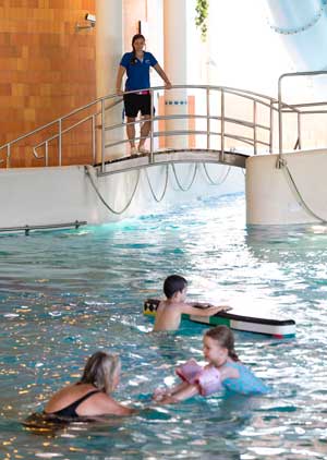 Det finns en nödstoppsknapp, livboj och simlärarstång att använda från kanten.