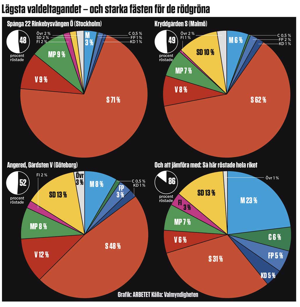 I valdistriktet ”Spånga 22 – Rinkebysvängen öster” röstade bara 48 procent av väljarna i riksdagsvalet, vilket är det absolut lägsta valdeltagandet i Stockholmsförorten Rinkeby.