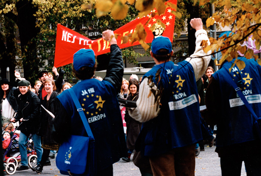 Nej till EU-demonstration möter Ja till Europa-aktivister 1994. Foto: Yvonne Åsell