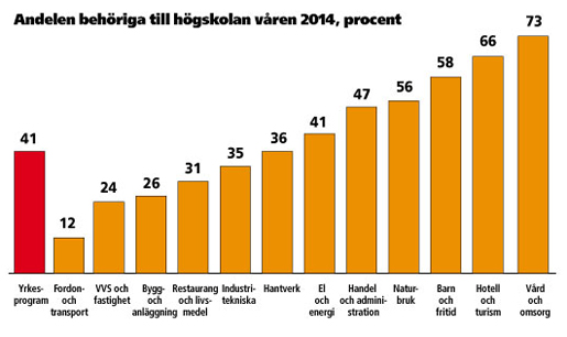 41 procent av dem som gick ut från yrkesprogram 2014 med godkända hade behörighet för högskolan. Bland dem som hade pluggat enligt den läroplanen var andelen 29 procent.