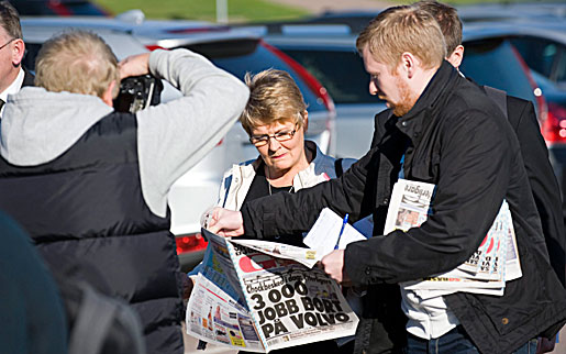 Göteborg i oktober 2008. Dåvarande näringsministern möts av rubriker om 3 000 jobb som ska bort på Volvo. Först nio månader senare tog regeringen beslutet om hjälp till omskolning med EU-pengar. Foto: BJÖRN LARSSON ROSVALL