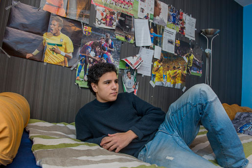 Jonas El Marghichi visar in till sovrummet som han delar med sin ett år äldre bror och sin lillebror som är tio år. Det är här vid ett litet bord i hörnet av rummet han tillbringar nätterna.