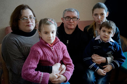 Irina och Andrej Chebotarova tar en dag i taget. Fem av barnen är på dagis, Miroslava, Dasha och Jeógenis är med och träffar Arbetet. Foto: Ivan Chernichkin