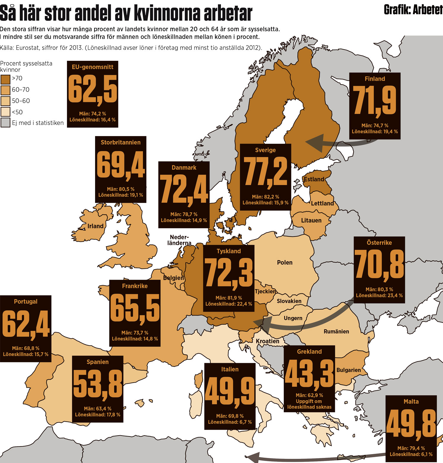 I Sverige beräknas 77 procent av kvinnorna ha en sysselsättning. I Danmark, Finland och Tyskland är det 72 procent. Betydligt längre ned hamnar Frankrike på 65 procent och Grekland på 43 procent.