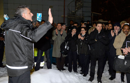 12 februari 2013. Ute i kylan. Relationerna mellan Arriva och Kommunal är riktigt frostiga. Denna kalla februarikväll får bussförarna inte hålla fackmöte inomhus som de brukar. Då samlas de utomhus i stället. Foto: Fredrik Sandberg