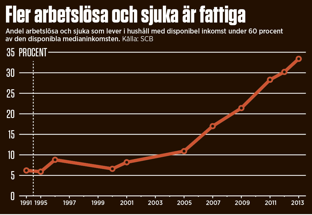 A-kassan blev dyrare och svårare att kvala in till och sjukförsäkringen förändrades. Men ökningen av andelen fattiga i gruppen arbetslösa och sjuka hade redan börjat, strax innan den globala finanskrisen utlöstes.