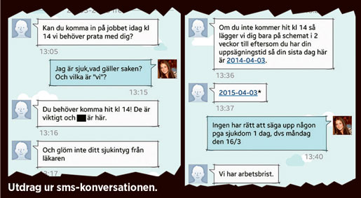 Arbetsledaren nöjer sig dock inte med det. ”Om du inte kommer hit kl 14 så lägger vi dig bara på schemat i 2 veckor till” skriver arbetsledaren och upplyser att den sista arbetsdagen för henne blir den 3 april.