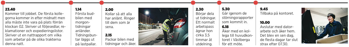 Britt-Marie Andersson är ansvarig för filialen i Sundbyberg som huserar i post- och logistikföretaget Brings lokaler. Strax före midnatt varje kväll börjar hennes arbetspass. Ett par timmar senare har budbilarna med Svenska Dagbladet, Dagens Nyheter och Dagens Industri anlänt.
