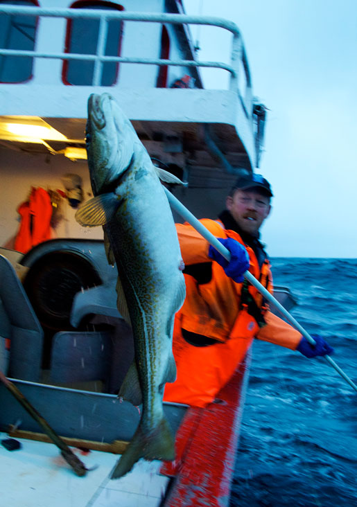 En efter en kommer de upp på linan, till synes välmående och av varierande storlek, många över tio kilo. Rekordtorsken vägde över 40. Efter att ha vittjat den första linan är plåtflaket fullt med torskar – som Børge skär pulsådern av och därigenom tappar på blod så att ”köttets kvalitet blir bäst”.