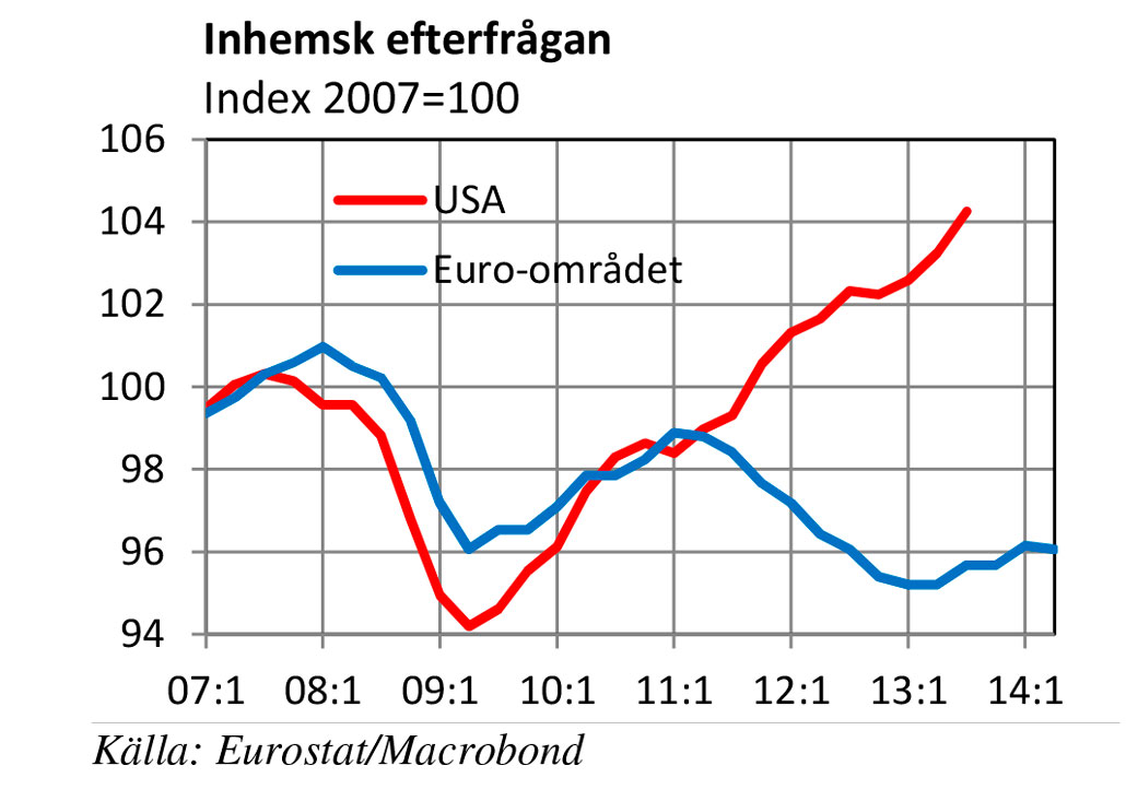Siffrorna i grafen visar som sagt den inhemska efterfrågan, men motsvarande bild på stor skillnad mellan USA och Europa visas av grafer över tillväxten eller vilken faktor över expansiv ekonomi som än väljs.