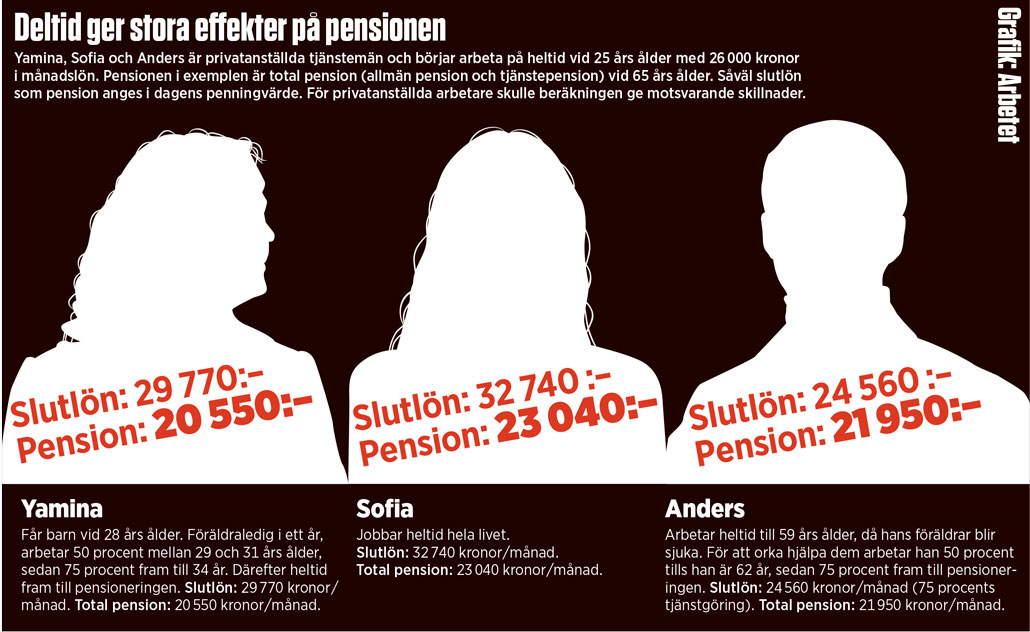 • Deltidsarbete i ung ålder sänker pensionen kraftigare än deltid mot slutet av yrkeslivet. I rapporten jämförs två privatanställda löneadministratörer som båda börjar arbeta vid 25 års ålder med 26 000 kronor i månadslön. Den ena får barn och arbetar deltid de sex åren då hon är 29 – 34 år, den andra tar hand om sjuka föräldrar och arbetar lika mycket deltid de sex sista åren före 65-årsdagen. Den senare löneadministratören kan räkna med 1 400 kronor mer i pension per månad än den förra. Det här beror främst på att premiebestämd pension som tjänas in tidigt i livet hinner förräntas (öka i värde) under fler år.