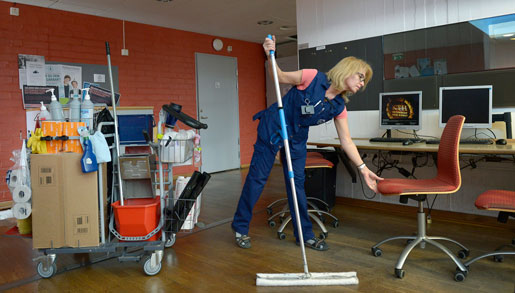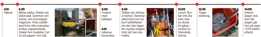 Hon får förklara att städarna har olika uppgifter i olika rum. Och att de börjar klockan sex innan andra yrkesgrupper eller studenter har kommit till Kungliga Tekniska högskolan.