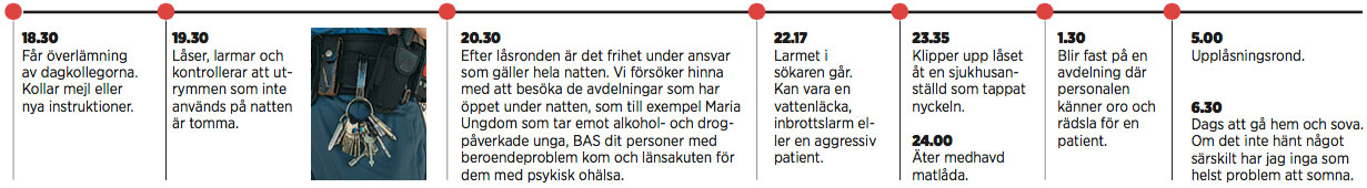 I livremmen hänger nyckelknippa, ficklampa, batong – som han nästan aldrig använder – och handklovar. Radions monofon och sökaren för larmen sitter på axeln.