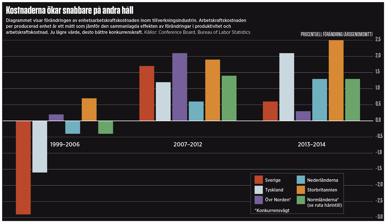 Utvecklingen under den innevarande avtalsperioden skiljer sig från tidigare år. Mellan 1999 och 2006 bidrog mycket stark produktivitetsutveckling till att att påtagligt förstärka den blågula industrins kostnadsläge. Åren därefter – 2007 till 2012 – steg kostnaderna aningen snabbare i Sverige, men skillnaden uppgick bara till tre tiondelars procent per år.