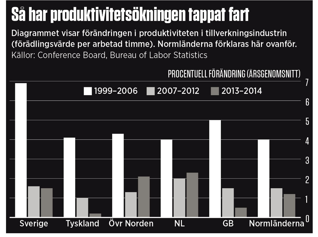 Bakgrunden till utvecklingen är tvådelad. Från 2007 skedde en påtaglig inbromsning av produktivitetstillväxten. Eftersom effektivitetsökningen var snabbare i Sverige, så blev även nedväxlingen mer påtaglig för svensk industri.