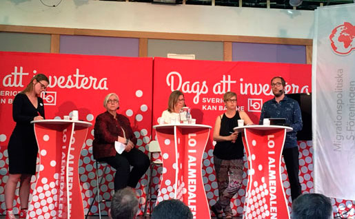 Hur skyddade är arbetskraftsinvandrare? Moderator Julia Ekedahl, LO:s Keth Thapper, Svenskt Näringslivs Karin Ekenger, Dagens Arenas Lisa Pelling och Magnus Nilsson, Palmecentret, diskuterar. Foto: Erik Larsson