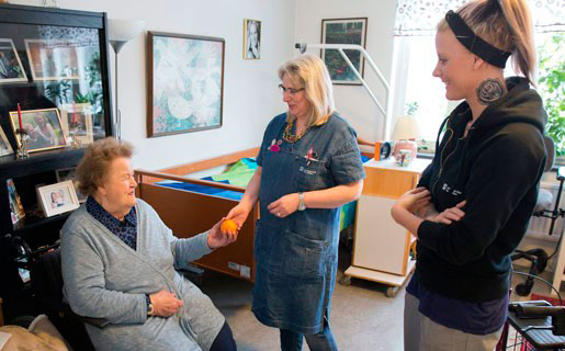 Undersköterskorna Carina Dahl och Stina Magnusson-Otter gläds åt nya arbetsscheman på Svartedalens äldreboende. Här umgås de med brukaren Ingrid Karlsson på hennes rum. Foto: Björn Larsson Rosvall