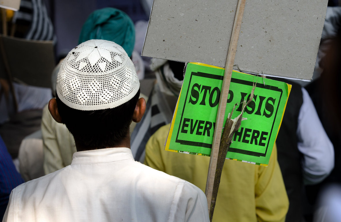 An Indian Muslim man holds a banner and listens to a speaker during a protest against ISIS, an Islamic State group, and Friday's Paris attacks, in New Delhi, India, Wednesday, Nov. 18, 2015. Multiple attacks across Paris on Friday night have left more than one hundred dead and many more injured. (AP Photo/Manish Swarup)