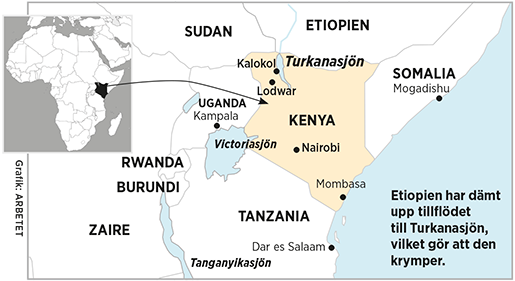 Han har rätt. Vattenbrynet har verkligen rört sig utåt. Sjön krymper – snabbt. Anledningen är inte i första hand den svåra torkan, utan en ny damm i Etiopien som dämmer upp vattnet i Omofloden, sjöns största tillflöde. Etiopien använder dessutom stora delar av flodvattnet nedströms till konstbevattning av jordbruksmark.